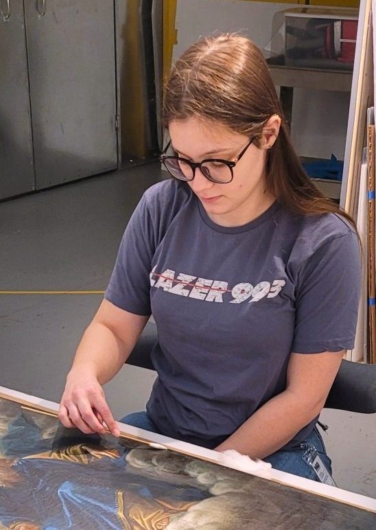Tailor, pictured here treating an oil painting on canvas, is currently working on her third-year internship in the Paintings Lab. During her internship, Tailor is treating a variety of paintings ranging in various mediums and substrates. She is advancing her knowledge in treatment skills, material knowledge, and analytical analysis, that will benefit her in future positions. Tailor completed her graduate degree from Queen’s University in Kingston, ON this past fall, 2025.